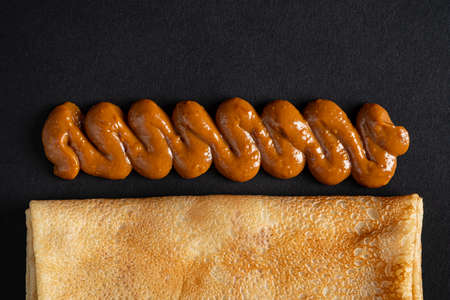 Romantic breakfast idea, red crepes or thin pancakes topped sweet hearts. Festive food for Valentines or Mothers Day. Trendy hard light, dark shadow. Black stone concrete background, copy space