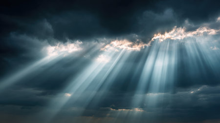 Majestic rays of sunlight break through dark clouds, creating stunning display of light and shadow in sky. This breathtaking scene evokes sense of wonder and tranquility