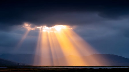 Dramatic rays of light break through dark clouds, illuminating landscape below. contrast between light and shadow creates moody atmosphere, evoking sense of wonder and tranquility