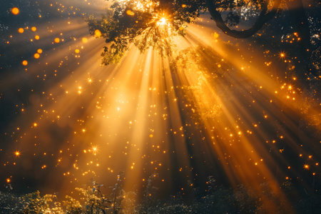 Enchanting Radiance Golden Light Rays Burst Through a Dreamy Fantasy Backdrop with Bokeh Effects