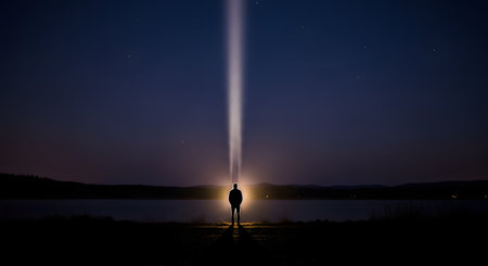 A lone person stands in a serene landscape, using a flashlight to illuminate the dark night sky filled with stars, showcasing the beauty and mystery of our universe.