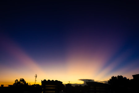 Experience the beauty of a serene sunset where dramatic rays of light pierce through colorful clouds in a deep blue sky, creating a peaceful atmosphere.