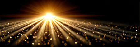 This captivating image features glowing sun rays streaming across a deep black background, offering a stunning visual contrast ideal for creative projects, modern graphic designs, and artistic