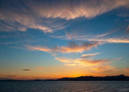 Twilight vibrant colorful sky above sea and mountain sihlouette at dusk time.