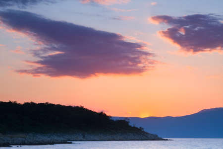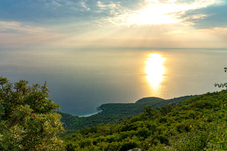 Sunset. Beautiful Mediterranean landscape. Montenegro, Adriatic Sea. View of Bay of Kotor near Tivat city, autumn