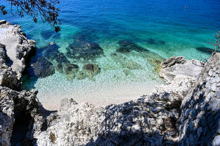High angle view of beautiful beach, coastal area, shore, coastline. Island of Cres, Lubenice Beach, Croatia.