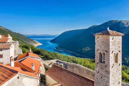 Croatia, island of Cres on Adriatic sea, amazing panoramic view of azure lagoon and beach under Lubenice town on sunny day.