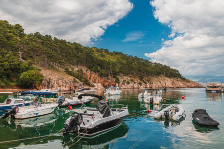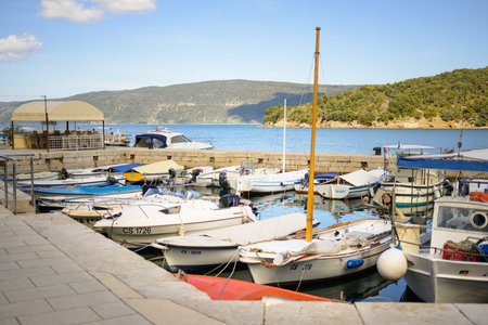 Valun, Croatia - April 12, 2022: An old idyllic harbor with little boats on a sunny day
