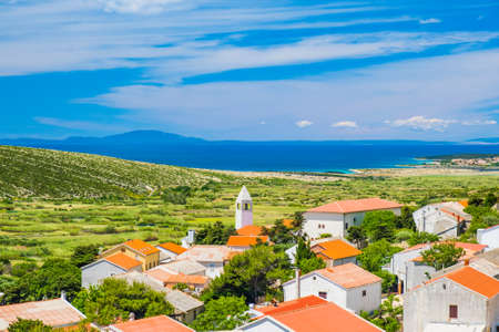 Old village of Kolan on the island of Pag in Dalmatia, Croatia, Adriatic seascape in background