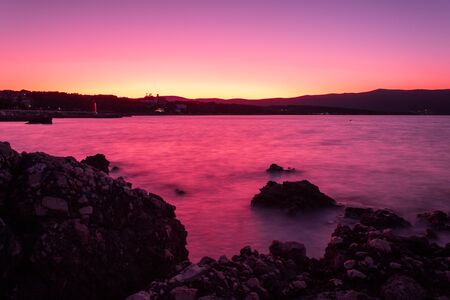 Dawn on the beach. The effect of silk water. Purple and yellow tones. Krk, island of Krk, Croatia.