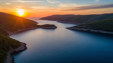 A tranquil sunset casts golden rays over a deep blue sea, with verdant, tree-covered hills curving around a serene bay.