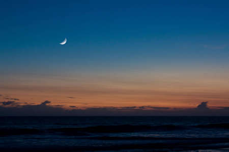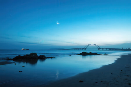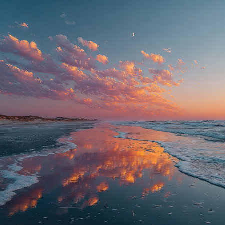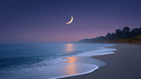 This tranquil coastal scene captures a crescent moon over calm waters at twilight, with gentle waves lapping at the sandy shore. The serene atmosphere invites relaxation and reflection.