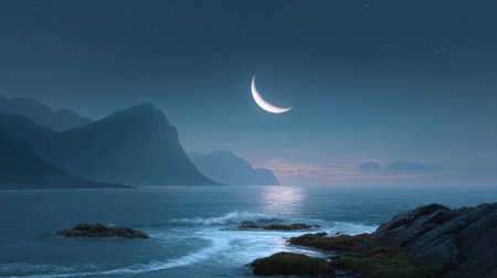 A captivating night landscape featuring a crescent moon casting soft light over a calm ocean, with majestic mountains in the background under a starry sky.