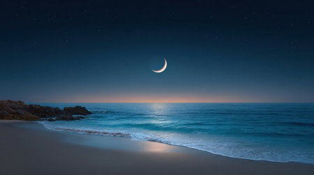 Experience the beauty of a tranquil beach at night, featuring a crescent moon reflecting on gentle waves, enveloped by a serene atmosphere and starry sky.