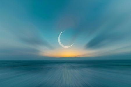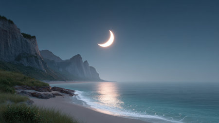 A tranquil coastal scene showcases a crescent moon glowing above calm waters, with scenic cliffs in the background during the twilight hour.