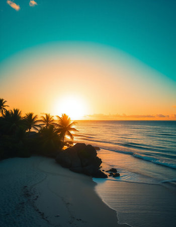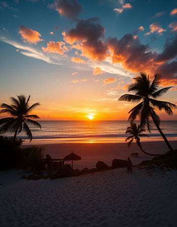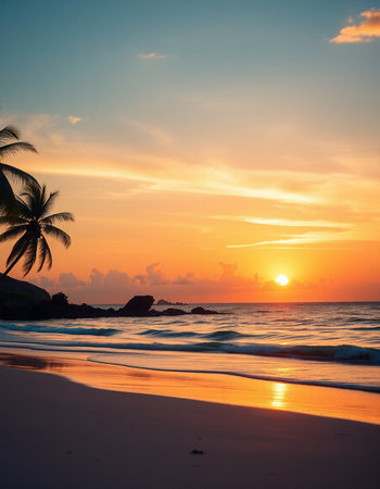 Beautiful sunset on the beach with palm trees and blue sky.