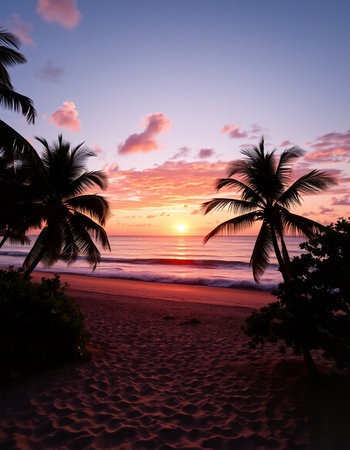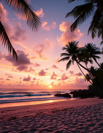 Beautiful sunset on the beach with coconut palm trees and sand.