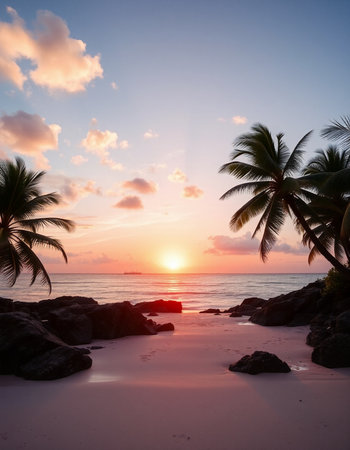 Under a star-studded sky, gentle waves kiss the shore while palm trees sway softly. The soothing sounds of the ocean create a peaceful ambiance, inviting relaxation and wonder.