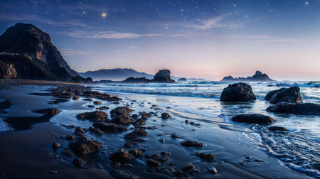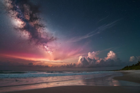 An AI generated illustration of Nighttime beach scene with a breathtakingly beautiful starry sky, creating a mesmerizing and dreamy ambiance