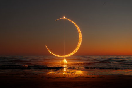 A radiant crescent shape hovers above tranquil water reflecting a gradient of colors. The image showcases the interplay of light and dark, with soft textures suggesting a peaceful environment. Suitable for artistic projects, design elements, and conceptual visuals. The image evokes serenity and could be used for various editorial purposes.