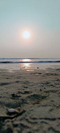 A serene view of a beach at sunset, with the sun setting over the ocean, creating a beautiful and peaceful atmosphere.
