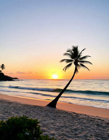 Silhouette of palm tree on a tropical beach at sunset.