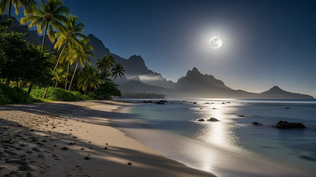 Serene beach scene with full moon, palm trees, and mountains