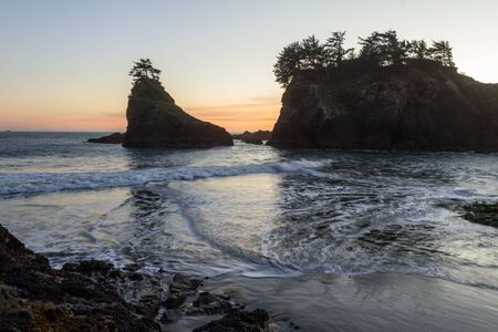 The sun sets on Secret Beach in the southern Oregon coast at sunset with its many Islets topped with evergreen trees and blurred waves moving in as the tides change