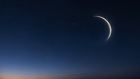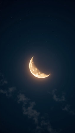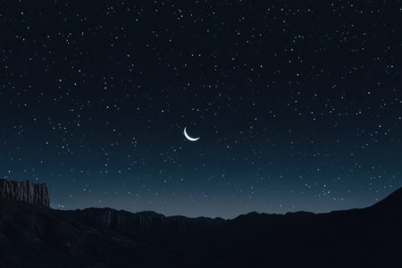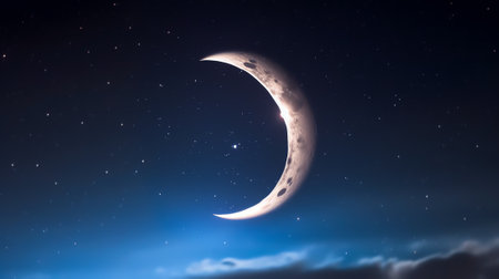 Delicate crescent moon illuminates the night sky amidst twinkling stars and serene darkness