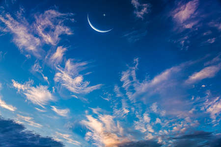 Crescent moon in dark sky. Hazy clouds at twilight. Celestial night background. Romantic atmosphere.