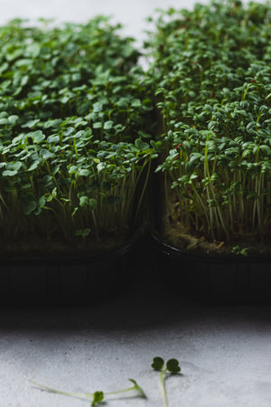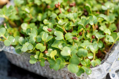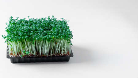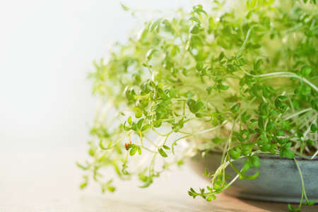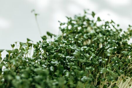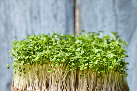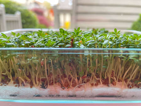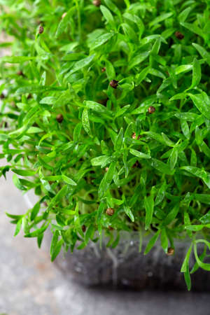 Vegan and healthy superfood.Planting microgreens. Germination of seeds at home.Vegan and healthy eating concept.Closeup organic microgreen of watercress.