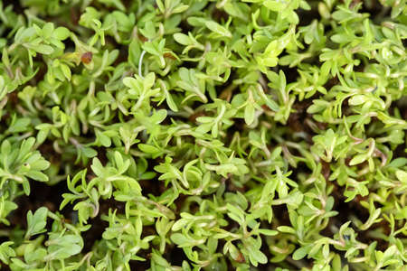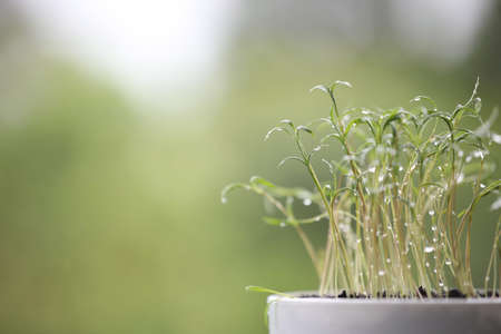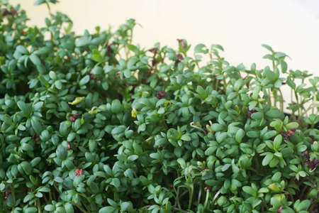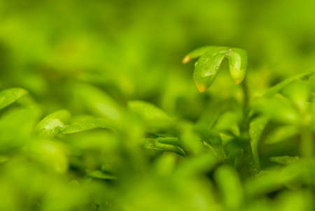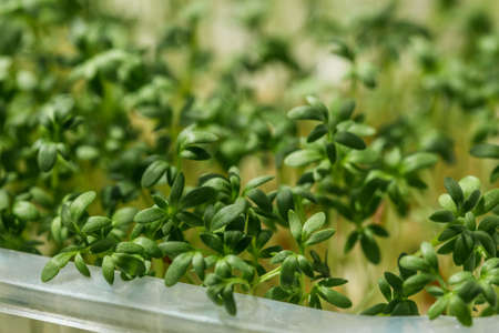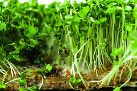 Green watercress microplants closeup after germination process