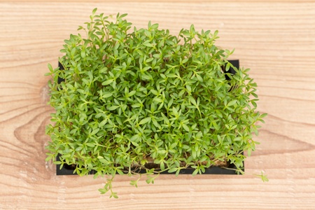 Organic cress in a wooden box on an old rustic wooden garden table