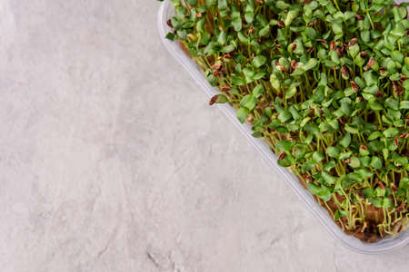 Home gardening. Succulent organic micro greens in a plastic box. Micro green from mustard. Fresh micro green sprouts for vegan cooking. Healthy food and diet concept. Cut microgreens.