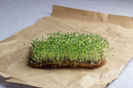 Closeup of sprouted grains cress salad grow on wet linen mat