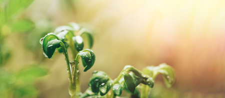 Young cress salad microgreen sprouts with water drops macro closeup. Superfood, the concept of a healthy lifestyle. Long wide banner