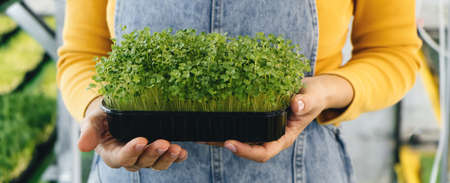 Woman holding box with microgreen, Small business indoor vertical farm. Close-up of healthy vegetarian vitamin fresh food. Microgreens growing background with raw sprouts in female hands