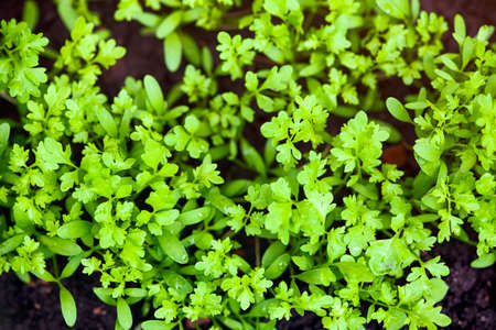 Green organic garden cress grows outdoors. Close-up