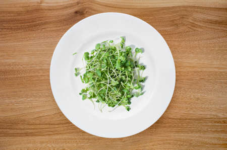 A lot of radish microgreens on a white plate on a wooden table. View from above