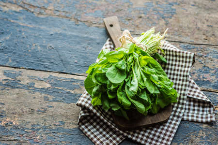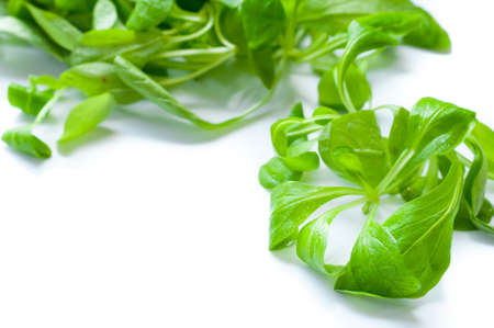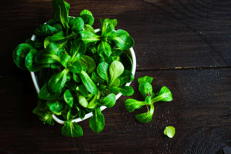 Healthy food concept - corn salad leaves on rustic background wih copyspace