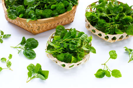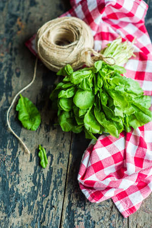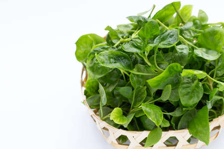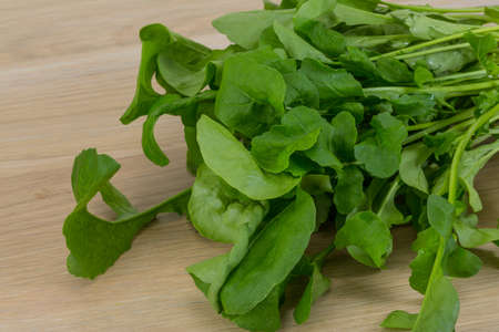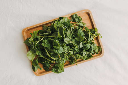 Green and fresh pile of Watercress served on wooden plate with white cloth background.