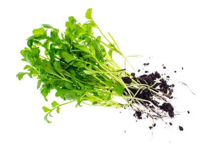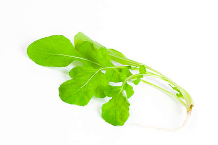 Ripe organic rocket salad (Eruca sativa) isolated on white