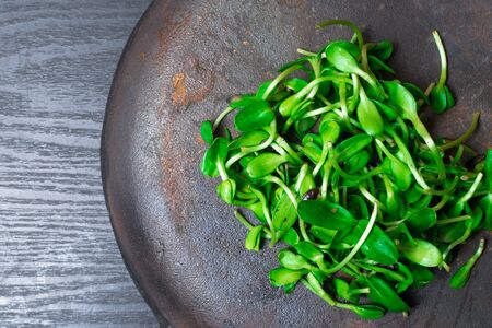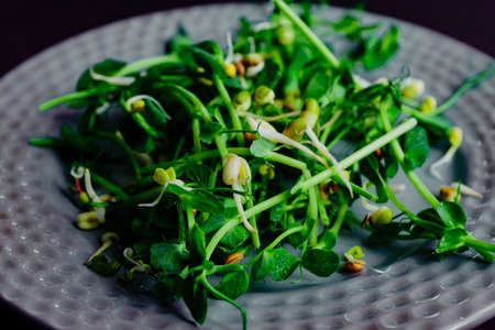 Fresh microgreens closeup. Growing sprouts for salad on a plate. Healthy eating.