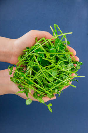A woman holds micro greens grown at home in her hands. Healthy and healthy food. Vegetarian food. Micro-greens for salads and meals