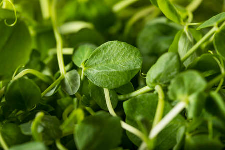 Pea microgreens on wooden table. Micro greens pea sprouts with fresh leaves