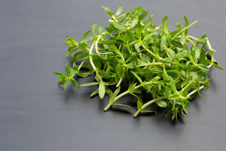 Organic watercress freshly harvested, arranged on a dark moody surface for food styling