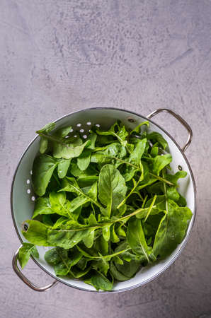 Organic food concept with fresh leaves of ruccola herb on dark background
