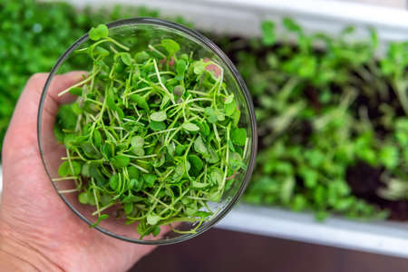 Micro-greens of mustard, arugula and other plants in a woman's hand. Growing mustard sprouts in close-up at home. The concept of vegan and healthy food. Sprouted seeds, micro-greens