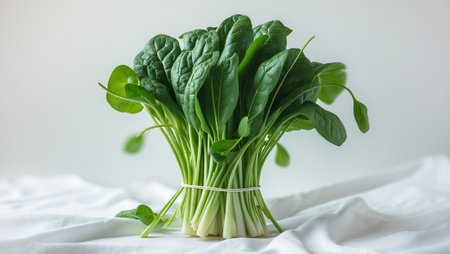 Fresh spinach bundle displayed on a white surface against a light background showcasing vibrant greenery and earthy texture