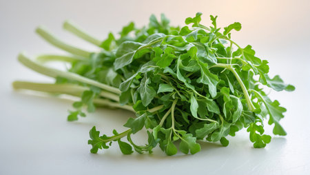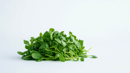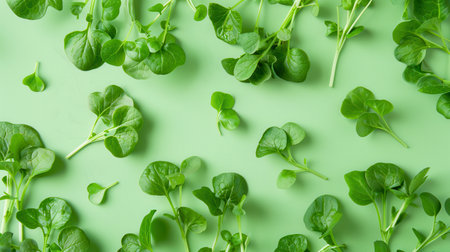 Fresh watercress leaves are scattered across a vibrant green background, creating a harmonious and organic pattern. The delicate leaves, with their rich green hues, evoke a sense of nature's beauty and abundance.